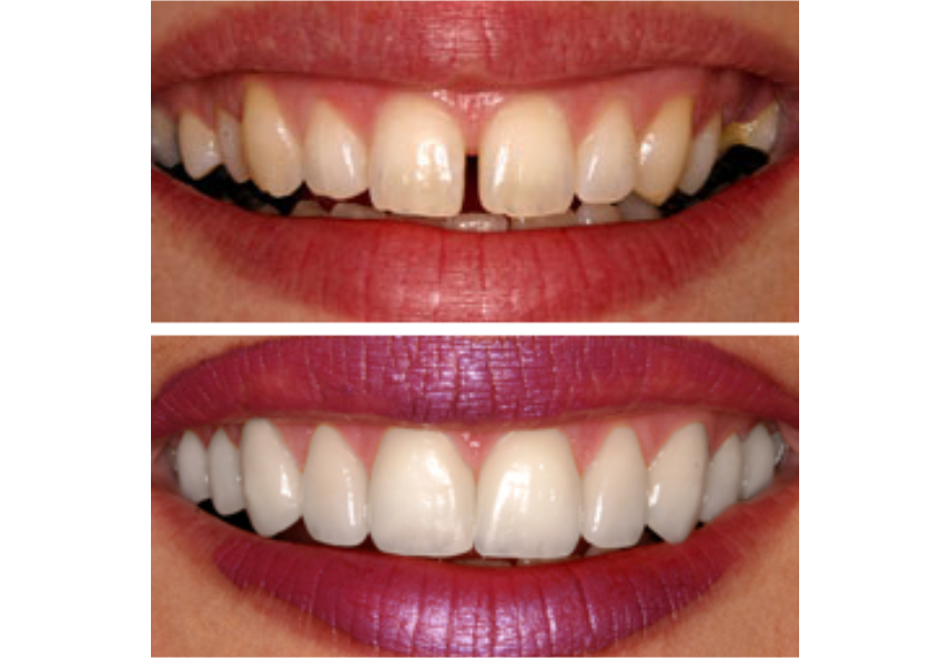 | A veneer is thin shell, wafer-thin (approx. 0,5 mm) of porcelain or composite that is bonded to tooth to improve its color and shape. They can be used to close spaces between teeth, lengthen small or misshapen teeth, or whiten stained or dark teeth, protect teeth from damage.